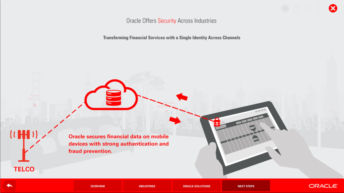 This screen reveals the “selected” state: the user has touched the red lock icon visible on the tablet in the foreground of the image prompting this overlay to appear. The infographic depicts what’s happening behind the scenes to allow this financial transaction to be secure: the data passes from the tablet to the cloud where it is securely stored, processed and retransmitted to the tablet through the security of the telco tower.