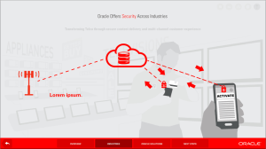 Here we see how Oracle secures the Telco industry. When the user clicks on either of the red lock icons, the overlay appears depicting how the private personal data of the client’s credit card and cell phone profile are transmitted, stored and relayed through a secure cloud and telco tower.